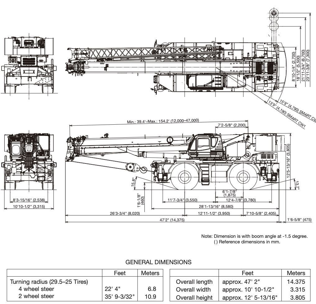 • boom: 39.4-154.2 feet